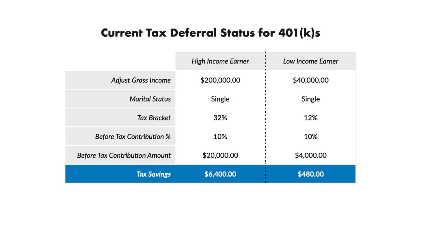 Right now, nearly two-thirds of the total tax benefit for 401(k) plans are enjoyed by the top 20% of wealthiest families. As designed, the higher the gross pay of an individual (and subsequently, the higher the tax bracket they fall into), the more that tax deferred 401(k) deduction will be worth in real dollars and as a percentage of income.
