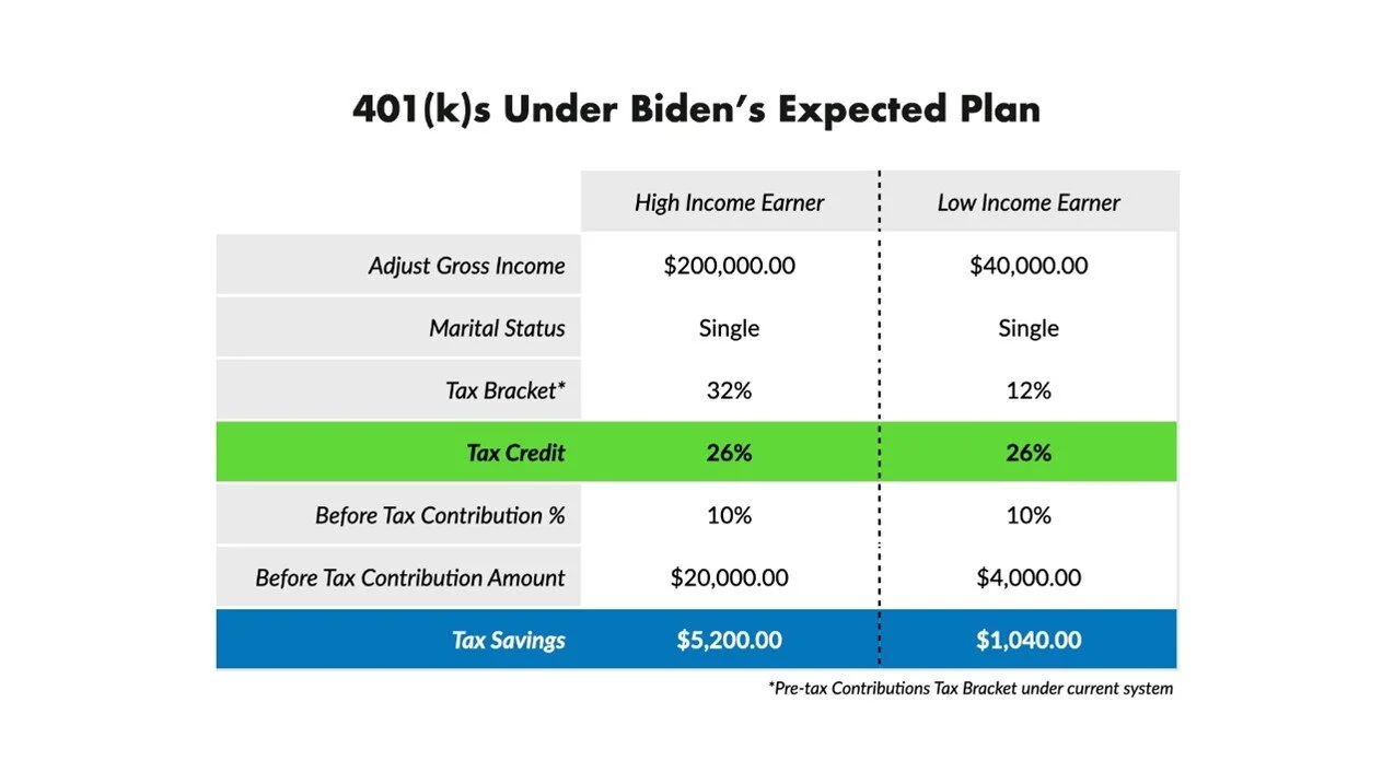 Biden and his Vice President, Kamala Harris, focused heavily on addressing economic inequality during the campaign, so it is no surprise that one of the biggest proposed changes to the 401(k) tax incentive structure is designed to level the playing field of retirement account tax savings.