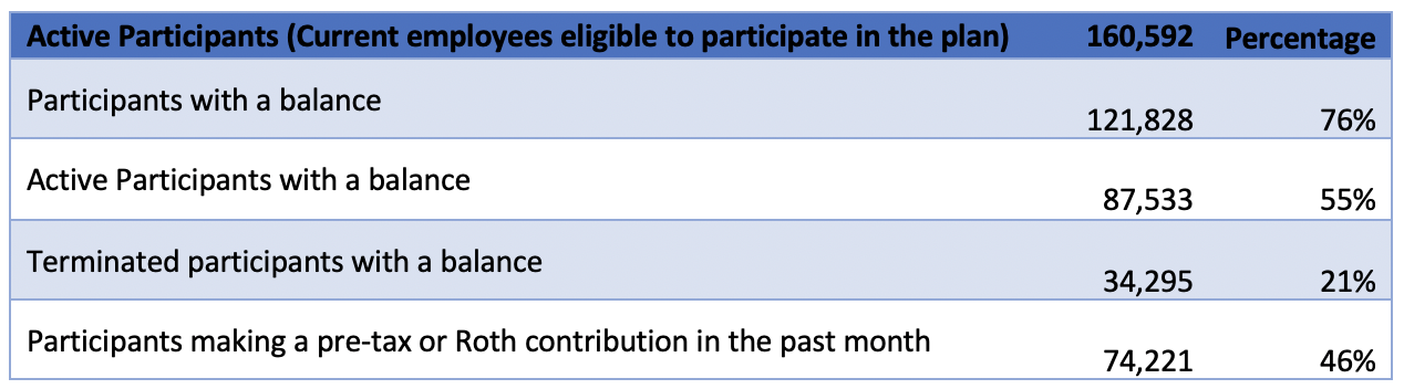 Neither option requires an employee to contribute their own money in order to receive an employer contribution, but it meets the criteria of an eligible participant with a balance. In our opinion, it is much more accurate to calculate the participation rate by taking the actively contributing participants (those contributing via pre-tax or Roth each pay period) divided by total eligible participants.
